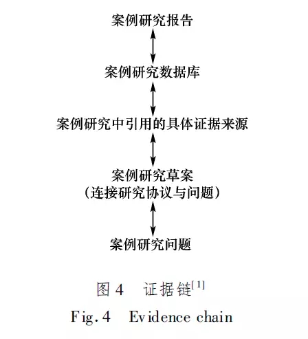 证据链是一个用户导向的概念,旨在将从研究问题到得出结论的过程清晰地展示给案例研究报告的读者。同时这个过程又是双向的,如图4所示,既能从问题出发到结论,又能从结论反推到问题,以便满足读者看到结论而产生的对了解论证过程的需要,同时也提高了案例研究报告对于读者的信服力。