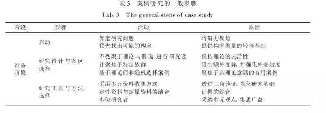 Eisenhardt研究了案例研究的一般步骤,郑伯埙等对其研究成果做了进一步的规整,将八个基本步骤归纳为三个阶段:准备阶段、执行阶段和对话阶段,如表3所示。表中的三角验证、跨案例研究、效度等术语在本文的其他部分予以解释。