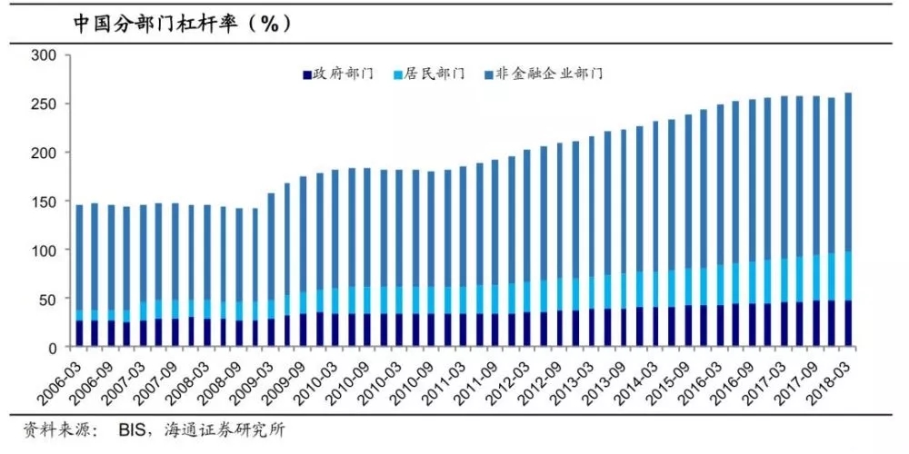 根据国际清算银行(BIS)的评估,截止2017年末,中国目前的非金融部门杠杆率达到了255.7%,不仅显著高于新兴经济体杠杆率的平均水平(193.6%),甚至已经超过美国(251.2%)等一些发达经济体。从2008年开始,以企业、政府、居民等非金融机构为主体,分别进行了三次明显的加杠杆,将杠杆率从当时的141.3%提高了近一倍。