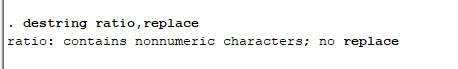 上面显示包括非字符的数据,也许你的ratio里面有字符型的数据,比如可能是“NA”这种缺失值,或者有空格也不一定,要是有“NA”的缺失值,可以先replace ratio="." if ratio=="NA",然后再destring