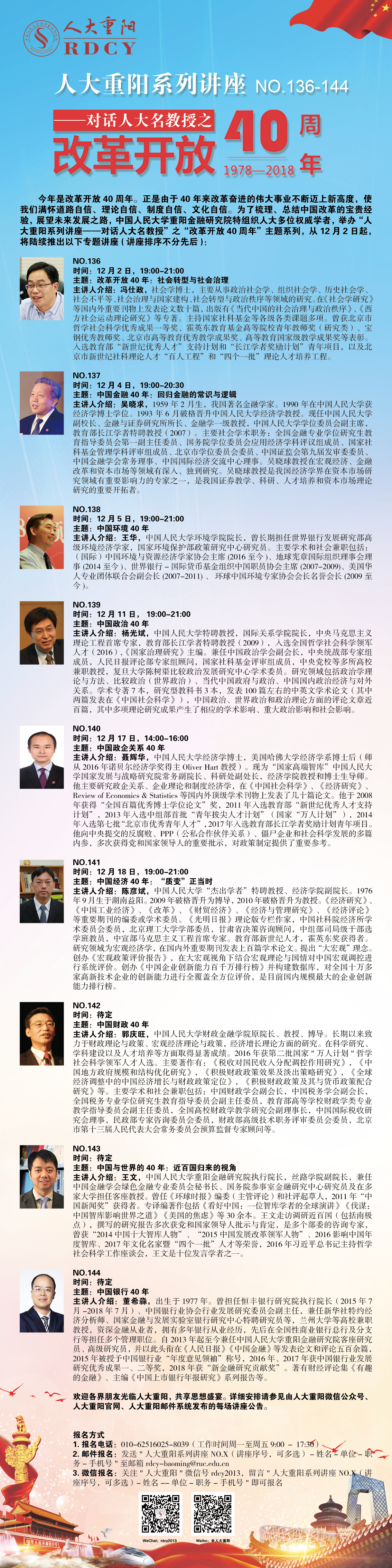 今年是改革开放40周年。正是由于40年来改革奋进的伟大事业不断迈上新高度,使我们满怀道路自信、理论自信、制度自信、文化自信。为了梳理、总结中国改革的宝贵经验,展望未来发展之路,中国人民大学重阳金融研究院特组织人大多位权威学者,举办“人大重阳系列讲座——对话人大名教授”之“改革开放40周年”主题系列,从12月2日起,将陆续推出以下专题讲座(讲座排序不分先后):