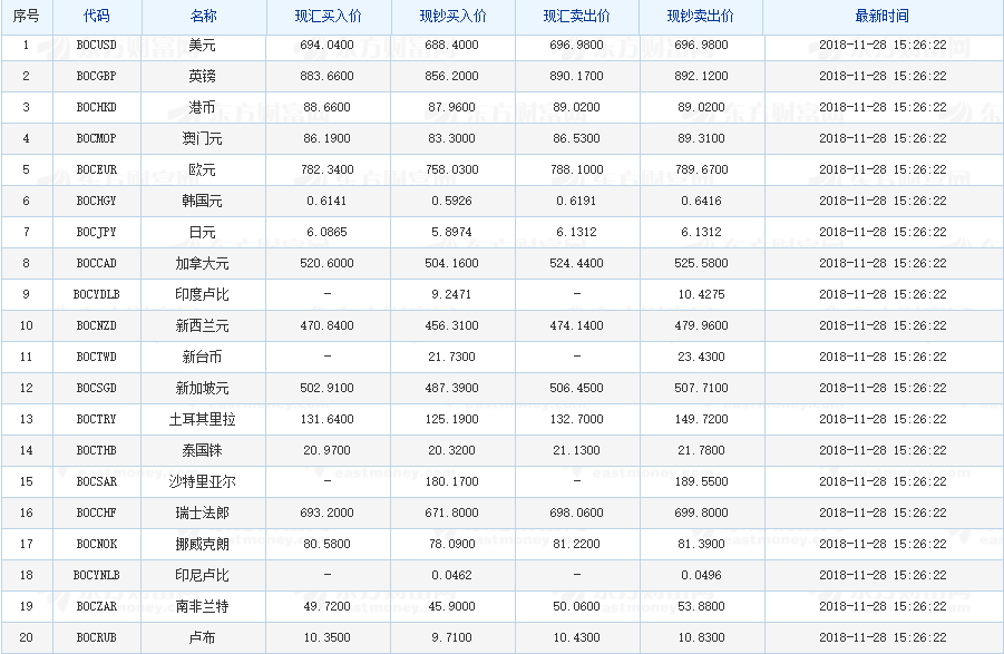 中国银行外汇牌价 2018-11-28(图片来源:东方财富网)