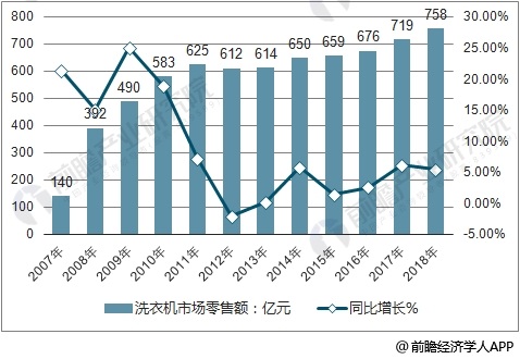2012至今属于市场盘整期,市场增长靠产品更新换代,产品结构持续升级,网络购物渠道稳定,消费群体年轻化,消费需求有个性。到了2017年中国洗衣机市场零售额达719亿元。预计2018年中国洗衣机市场零售额将达758亿元。