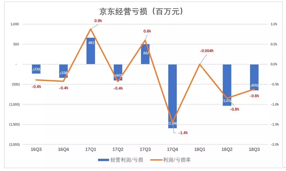 于是就这样僵持了下来。这种局面是京东商业模式决定的,偶有不到一个百分点的经营利润,下个季度又陷入连续亏损。