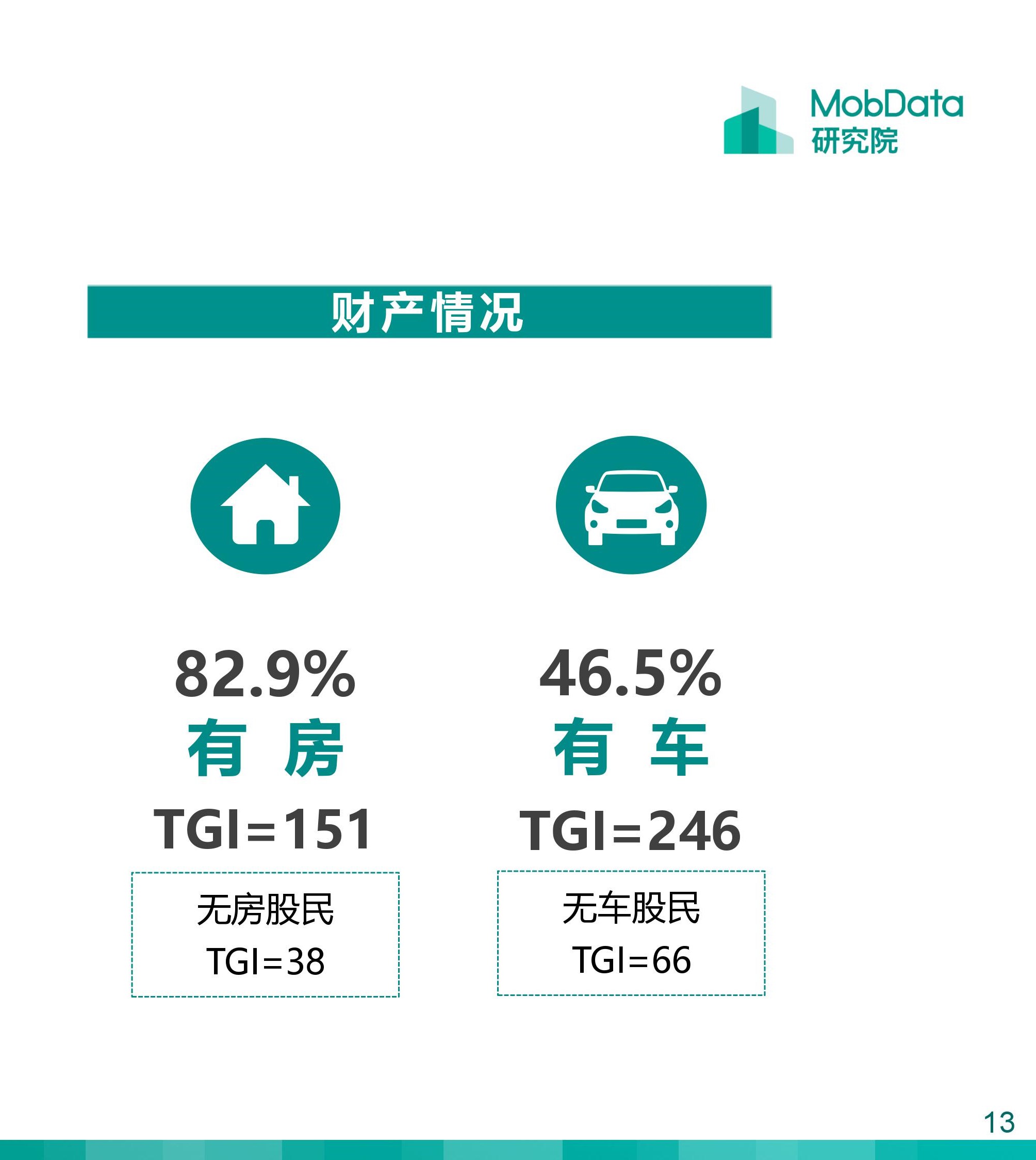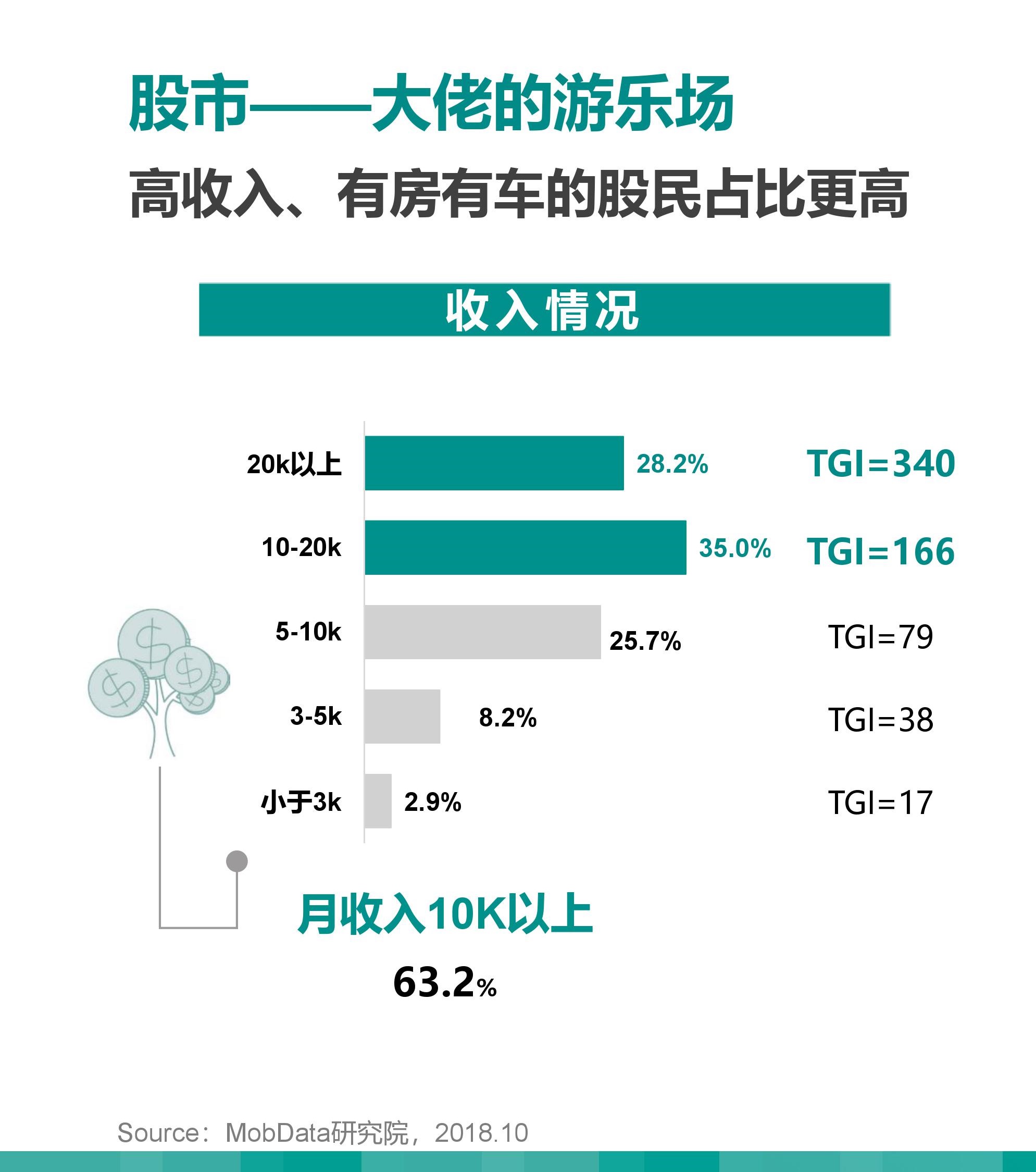 月收入10k以上的股民占比63.2%,月入20K以上的股民TGI高达340,有房股民占比82.9%,有车股民占比46.5%。