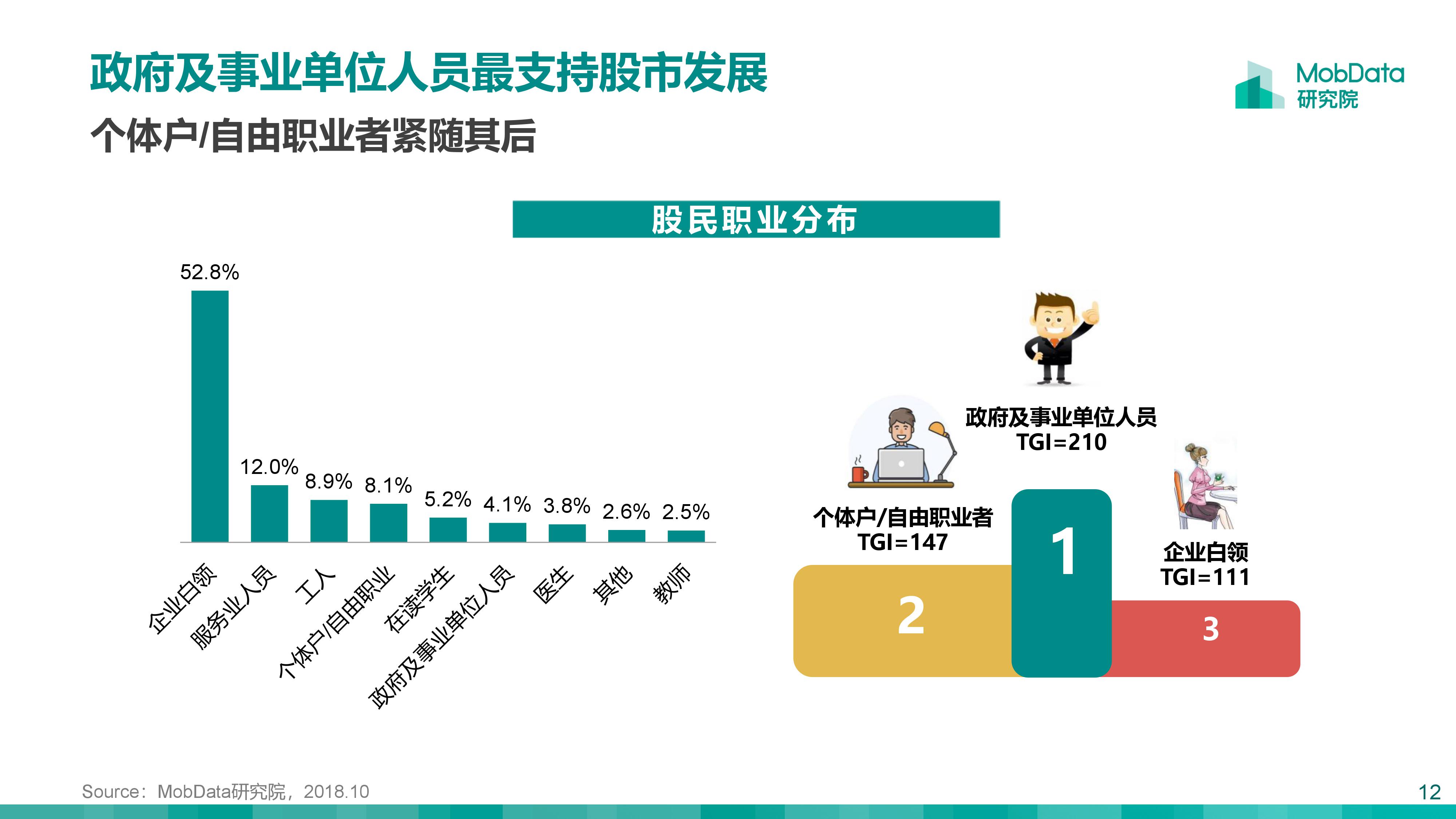 职业分布上,企事业单位白领、个体户/自由职业者属于最爱炒股的一群人。