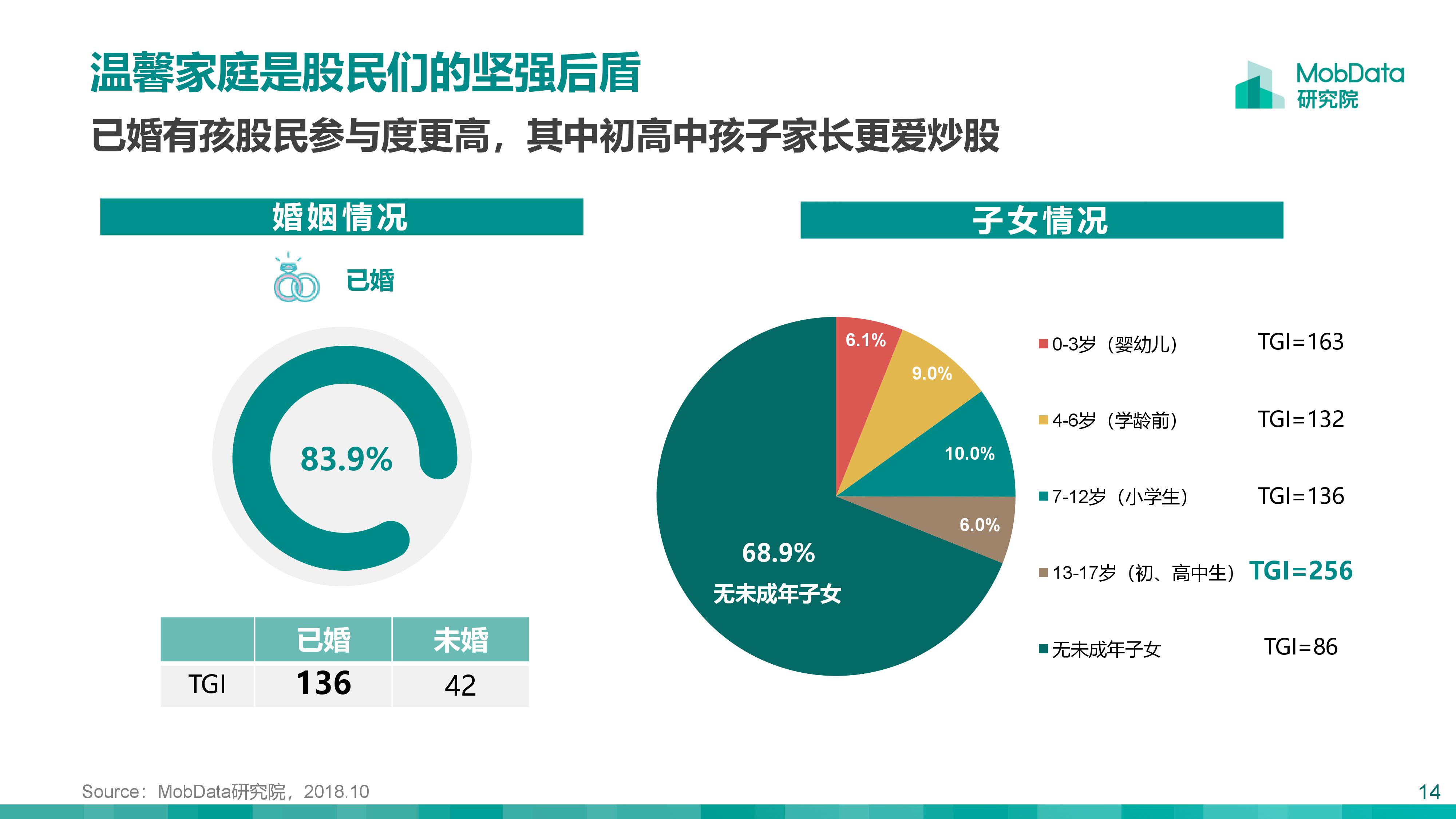 股民中已婚者占比高达83.9%,有13-17岁孩子的股民TGI最高。