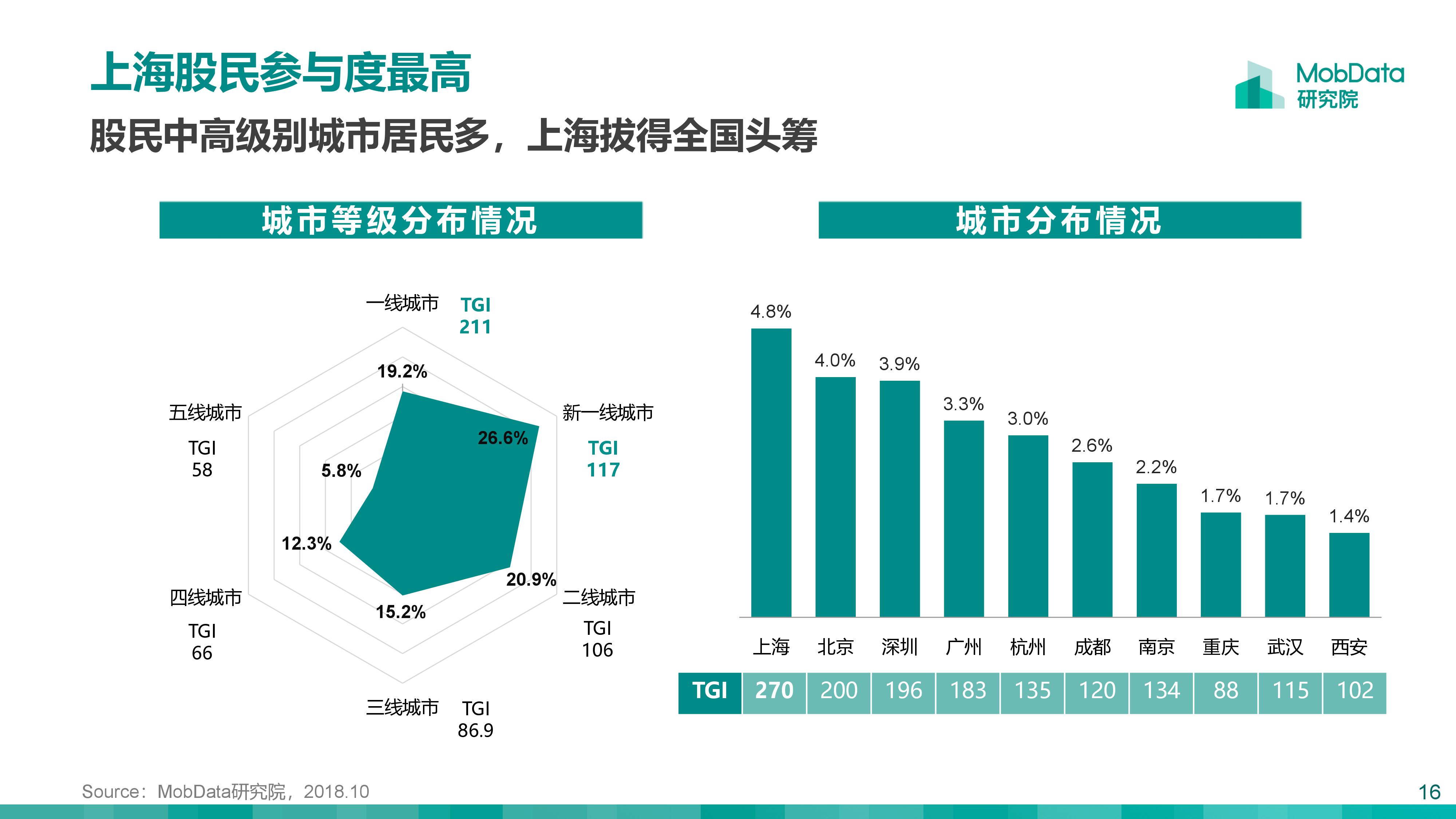 从城市分布来看,一线城市以及新一线城市居民中,股民规模更大。上海股民规模最大,北京、深圳、广州分列2-4位。
