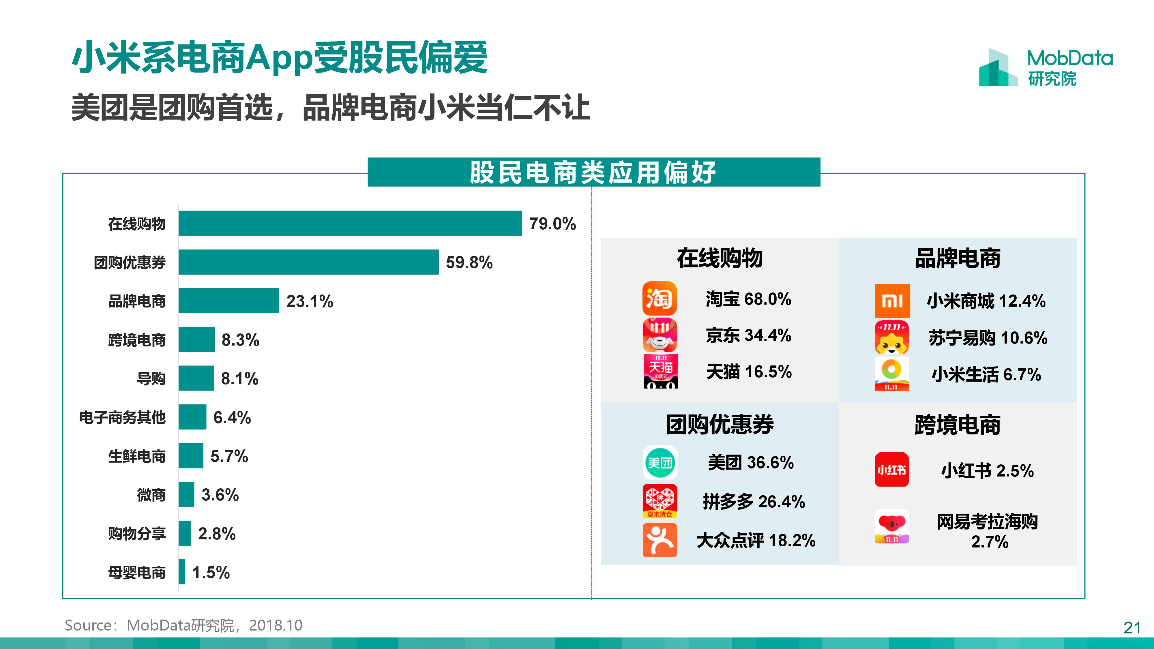 电商类应用中,在线购物、团购优惠券、品牌电商以及跨境电商分列股民偏好前四位。其中淘宝是在线购物App绝对霸主,美团是团购首选,小米商城以及小米生活分列品牌电商第一、第三。