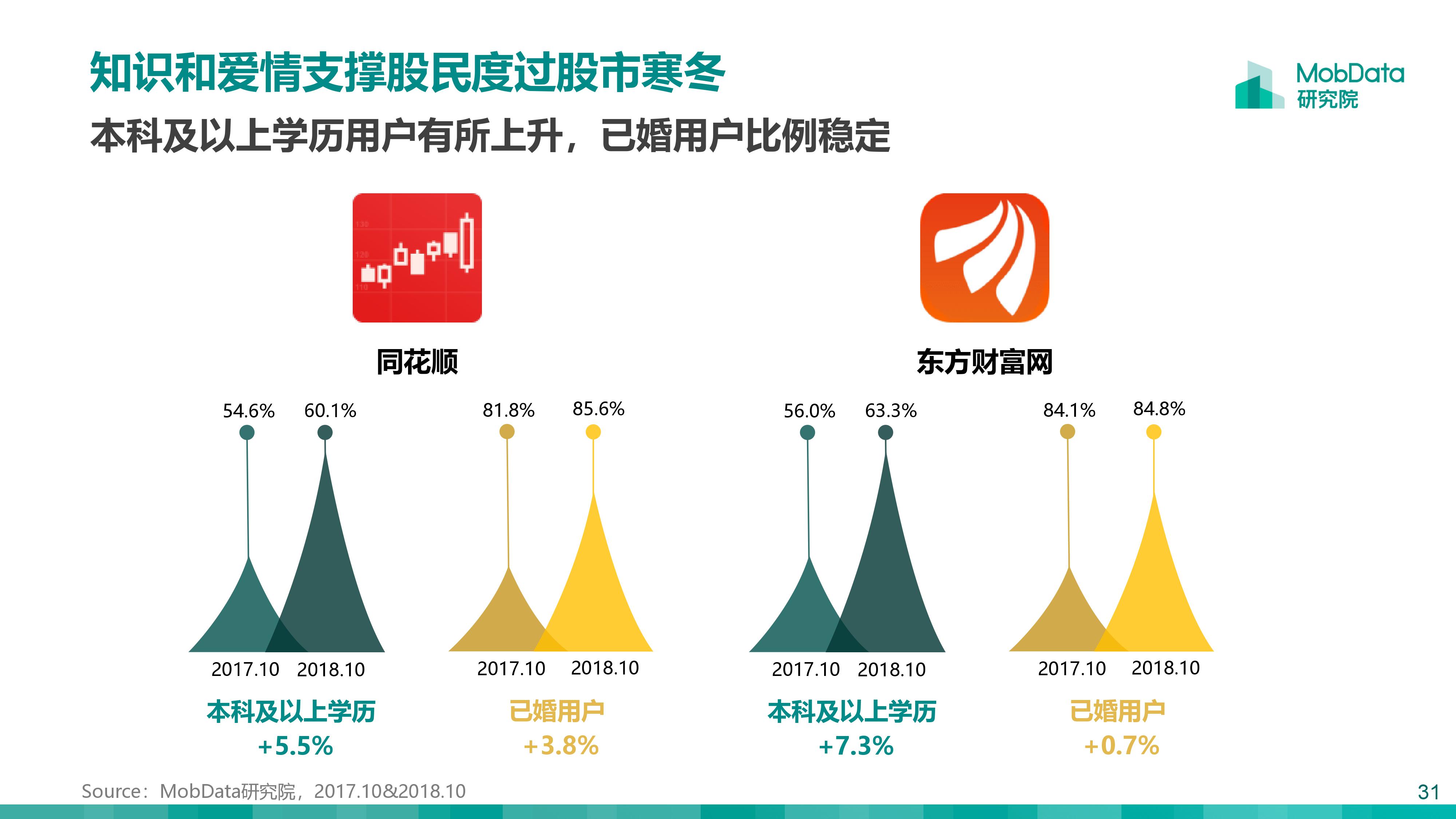 本科及以上学历用户上升,在波谲云诡的中国股市,靠运气和消息不靠谱,掌握知识才是王道。与此同时,已婚用户比例也略有上浮。