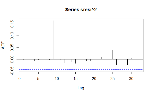 Ljung-Box Test R^2 Q(15) 57.63128 6.410778e-07