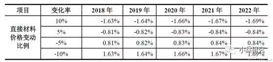 3、敏感性分析在假设其他因素不变的情况下,某种因素变化一定百分比后,将对毛利率的影响程度。上海沪工(603131)发行股份购买资产的案例中,主要原材料对标的公司收益法预测期间毛利率的量化分析中采用了敏感性分析法。如下图,假设其他因素不变,得出原材料变动一定比例对毛利率的影响结果。