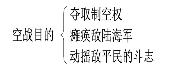 空战的目的主要有三个,分别是:夺取制空权,瘫痪敌陆海军和动摇敌平民的斗。书中写道:“战争中目标变化很大,而目标的选择主要取决于寻求的目的:是为了夺取制空权、为了瘫痪敌陆海军、还是为了动摇战线后方平民的斗志。(如图3所示)”