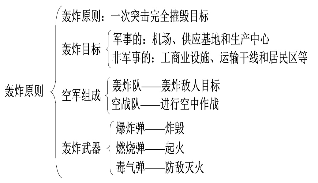 轰炸的主要武器包括爆炸弹,燃烧弹和毒气弹,三种武器的作用不同。书中写道:“摧毁这些目标需要用三种炸弹:爆炸弹、燃烧弹、毒气弹,其比例视情况而定。爆炸弹炸毁目标,燃烧弹使目标起火,毒气弹阻止消防人员灭火。”