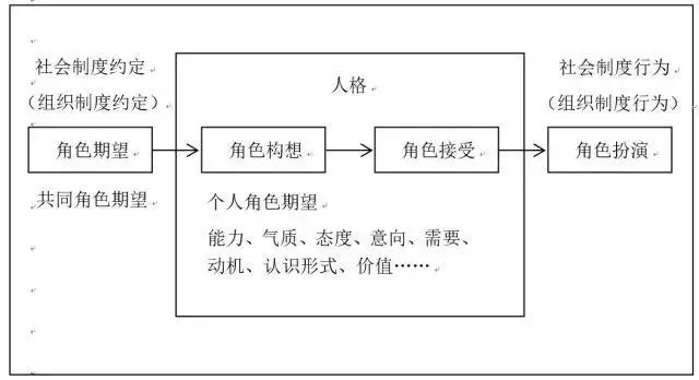 我们将上图中的“社会制度约定”和“社会制度行为”置换成“组织制度约定”和“组织制度行为”,可以用这一模型说明员工的角色实现。当企业进行角色管理时,先形成组织的共同期望;将其赋予员工,成为某种角色期望。而员工在自身的人格特征的“黑盒子”中,对该角色期望进行解读,进而完成自己的角色构想(Role Conception),即自我期望。例如,一个项目小组中的大多数人都希望张三能够明确项目方向,管控项目进度,带领大家攻关克难,这种共同期望赋予了张三“项目管理者”的角色。由于张三本身思想开放,善于沟通,喜欢头脑风暴而不喜欢专断,他会将“项目管理者”解读为一个“集思广益、善于聆听的项目管理者”,认为应该在项目中多鼓励、引导团队成员们提出合理建议。