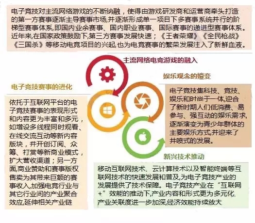 电子竞技产业发展起来,归根结底在于人们娱乐观念的转变;同时,主流网络电竞游戏、电子竞技赛事以及新技术的喷发,极大程度地拉动了电子竞技的崛起。