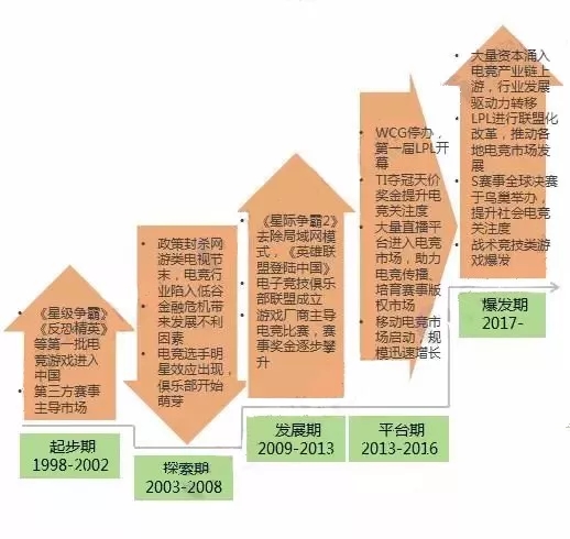 2000年前后,电竞在我国起步,在经历了政策压制、电竞俱乐部联盟成立以及直播平台进入市场之后,中国电竞行业在各方资本的涌入下,进入爆发期。