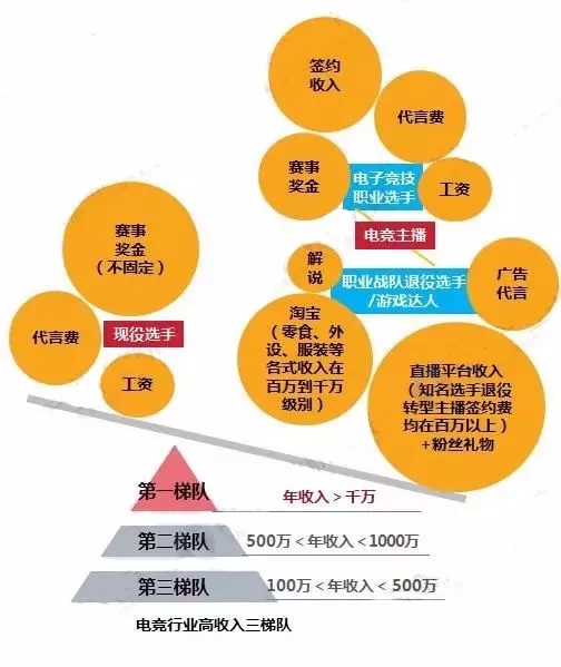 电竞主播基本分为三种类型:电子竞技职业选手,他们日常的工作生活都是围绕比赛进行的,收入来自签约收入以及现役选手的正常收入;另外两种类型一般为职业战队退役选手或是游戏达人,他们在各直播平台进行直播,收入来自平台签约收入、淘宝店收入、粉丝送的礼物、在直播时植入游戏厂商的广告等。