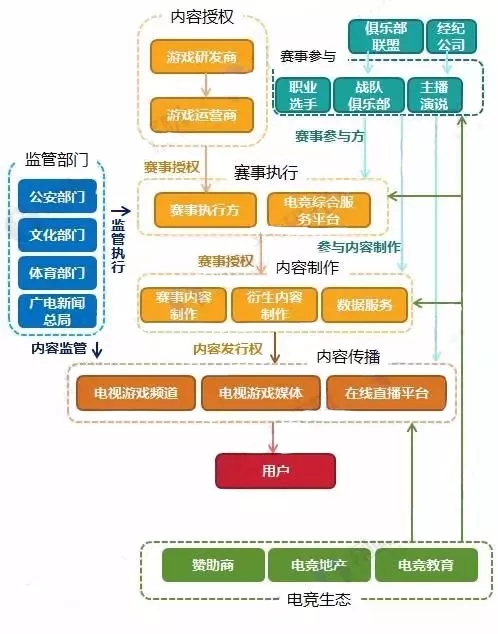 电子竞技在以赛事为核心的前提下,产业链逐渐完善,市场划分也更为细致,并在政府监管下逐步形成以游戏研发商和运营商为主导、俱乐部负责赛事参与、广告赞助商和赛事策划公司负责赛事的组织筹办以及赛事内容制作、直播平台和电视游戏频道负责内容传播输出的完整电竞产业链。