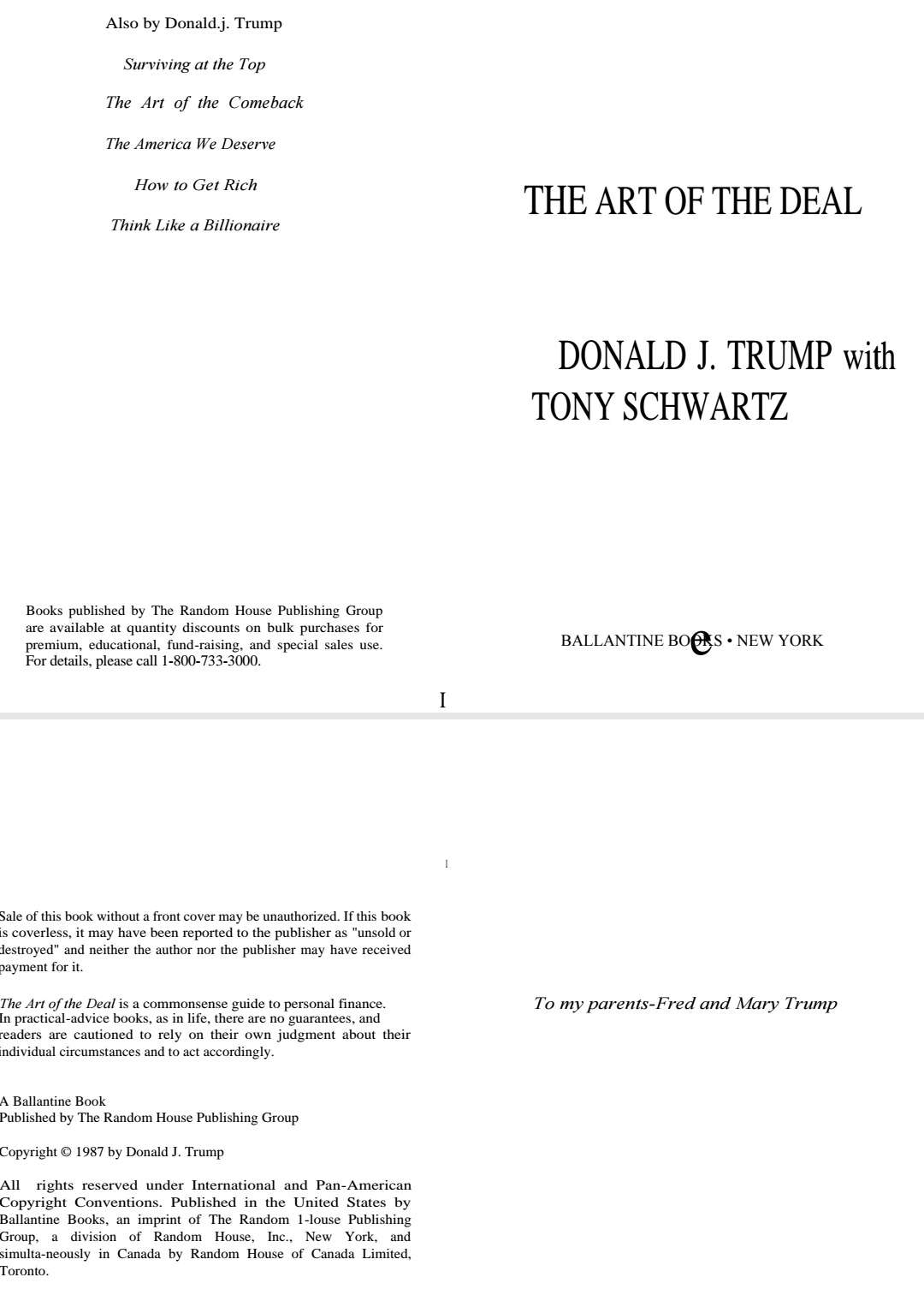 The art of the deal,记录着川普先生的故事,有自己的作息,有些他自己的职场道理,也有他对经商实践的个人观点。语言比较生动,挺有趣的一本书,适合工作之余看。<br>