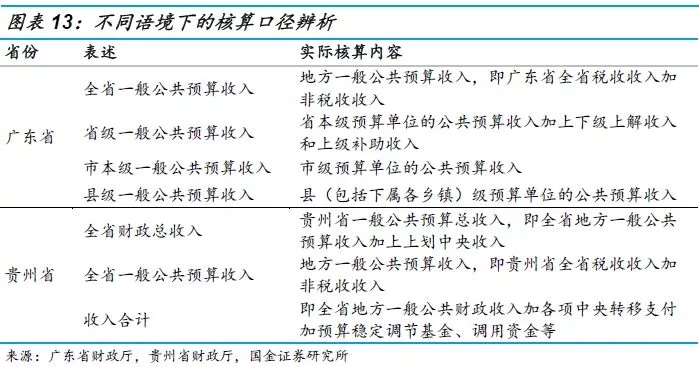 全口径:核算的是地方政府综合财力和地方政府财政收入,前者的范围更大,包括了国有经营资本预算收入或者预算外收入,后者是一般公共预算收入、政府性基金收入和预算外收入的总和。