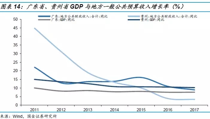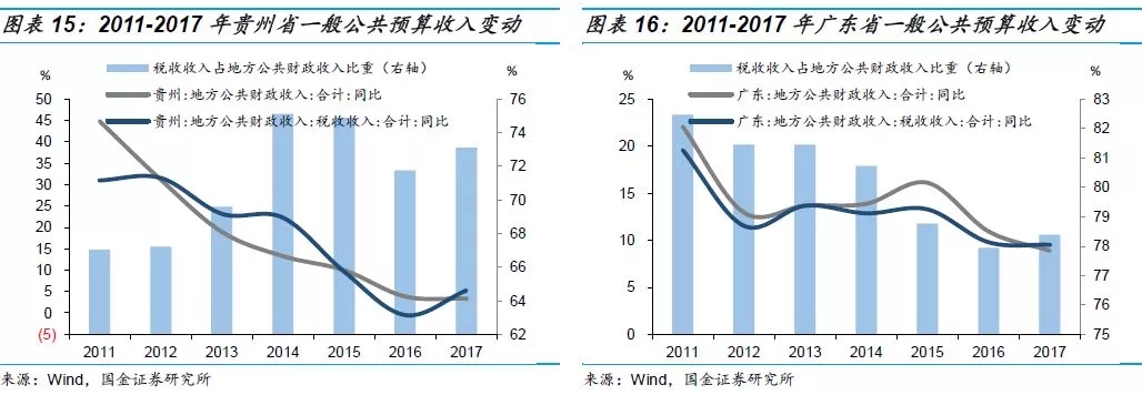 由于两省对于地方财政总收入的统计口径并不一致,我们采用广东省的口径,即地方财政总收入=一般公共预算收入+政府性基金收入,比较税收收入对两省财政总收入的影响。贵州省2016、2017年税收收入占地方财政总收入的比重为49.2%、45.8%,广东省为56.8%、52.4%。显然,贵州省的收入结构要差一些,同时由于基金收入占比过高,财政总收入波动更大。