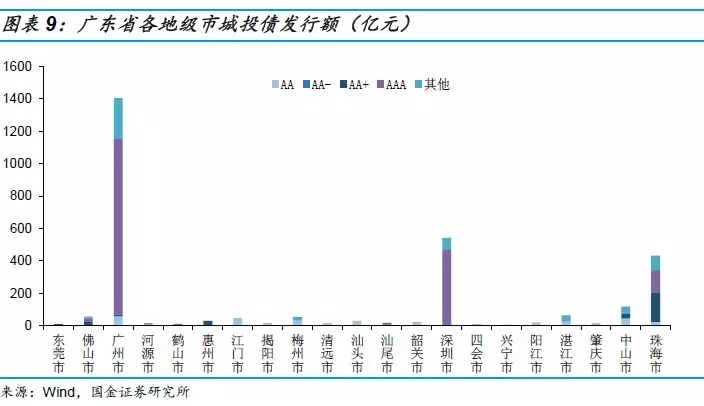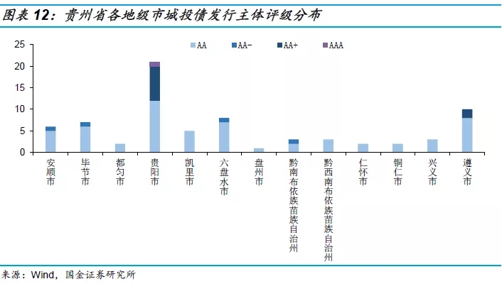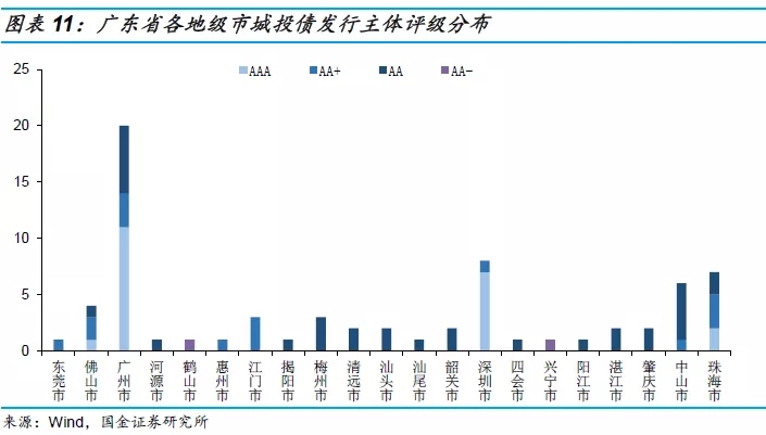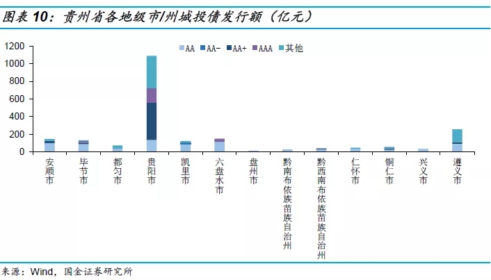总体上来看,广东省全省及各地级市城投债的发行规模大于贵州省。评级角度,广东省城投债发行主体评级整体高于贵州省,对比两省城投债发行规模排前两位城市,贵阳市AAA级8只,AA+级22只,AA级13只,广州市AAA级67只,AA+级2只,AA级10只;遵义市AA+级2只,AA级11只,深圳市AAA级24只,AA+级1只。两省较大的经济发展水平和财政实力差距,使得城投债的评级存在较大的差异。