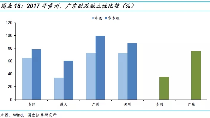 从全省数据看,广东省财政自给率较高,2017年达到75.22%,而贵州省只有35.04%,财政自给率处于较低范围。分城市来看,贵阳、遵义市本级和市级财政独立性都低于广州和深圳,广州的市级财政独立性最高。