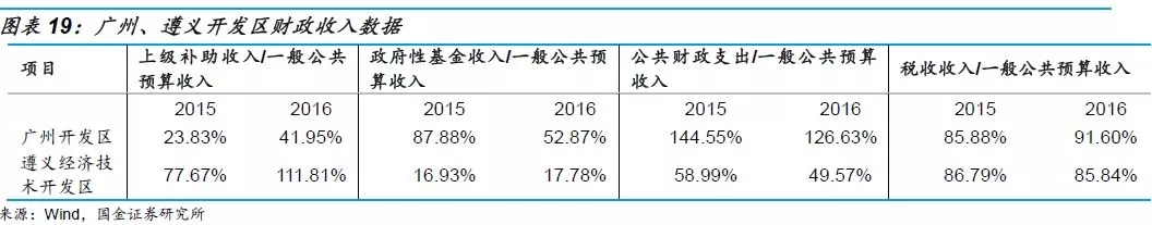 对于园区我们主要关注公共财政收入结构,上级转移支付收入和土地财政情况。对比广州开发区和遵义经济技术开发区的财政数据,主要结论如下: