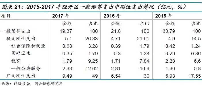 经开区地方综合财力60.29亿元,其中36.41亿元为地方本级收入,3.31亿元为政府性基金收入,20.54亿元为公共预算中转移性收入,0.03亿元为基金预算中转移性收入。经开区政府性基金收入占经开区综合财力比重仅为5.54%,土地出让金收入并不构成财政收入的主要来源,而税收收入占比达到56.46%,表明收入结构较为稳定。报告中也提及“2017年经开区纳税前十名企业合计完成税收总额为53.14亿元,其中前五名企业全部为医药企业,医药行业对税收贡献程度较大”,因此经开区财力增长容易受医药行业发展不确定性影响。