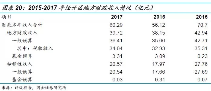 2017年,经开区一般预算收入为36.41亿元,同比增长3.86%,主要由税收收入构成,为34.04亿元;实现政府性基金收入3.31亿元,同比继续增长。同期,经开区实现转移性收入20.57亿元,同比增长14.49%;一般预算转移性收入增长16.30%,仍是其主要构成。