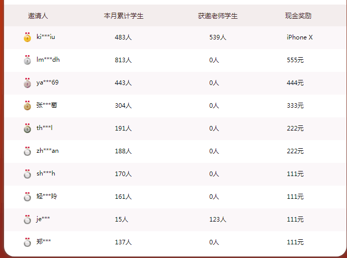 即日起,邀请老师入驻课堂(老师入驻时填写您的专属邀请码即可),被邀请的老师新增学生人数和邀请人课堂新增人数合计参与排行榜,多多邀请,大奖就是您的。