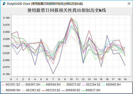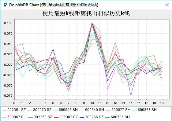 上面代码使用的moving是DolphinDB的模板函数,表示在大小为num,边界为beginDate和endDate的滚动窗口中计算两段k线之间的距离。square_sum{edifier.pct_change}是DolphinDB中的部分应用,用于固定函数的部分参数。找出与漫步者2016年9月1日到2016年9月30日最为相似的10段历史k线。