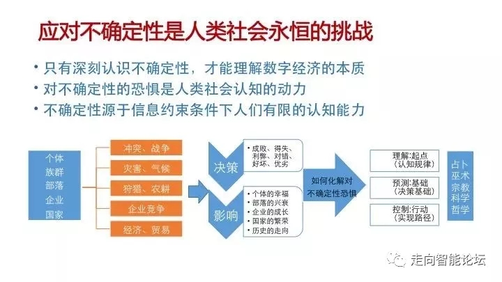 应对不确定性是人类永恒的挑战,关于如何理解和认识不确定性,我们有三个基本结论:一是只有深刻认识不确定性,才能理解数字经济的本质;二是对不确定性的恐惧是人类社会认知的动力;三是不确定性源于信息约束条件下人们有限的认知能力。
