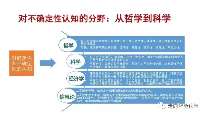 我们如何来认知不确定性,从哲学来看,在古希腊一开始就分成了两种不同的学派,到了近代形成了以笛卡尔为代表的确定性世界,认为这个世界是有序的、统一的、必然的、精确的及可预见的;而尼采、康德认为这个世界是无序的、差异的、随机的、模糊的不确定性世界。