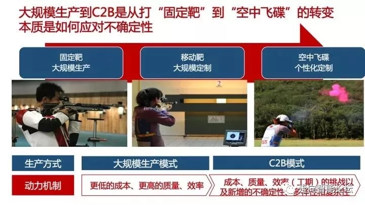 从规模化生产演进到个性化定制,这其中不确定性在逐渐增加。就像一场射击比赛,规模化生产是一个固定靶,大规模定制相当于移动靶,而个性化定制就像一个射击空中飞碟。要不断地感知它从哪飞起来,在哪拐弯,速度有多快,然后去分析、判断,进而决策执行。