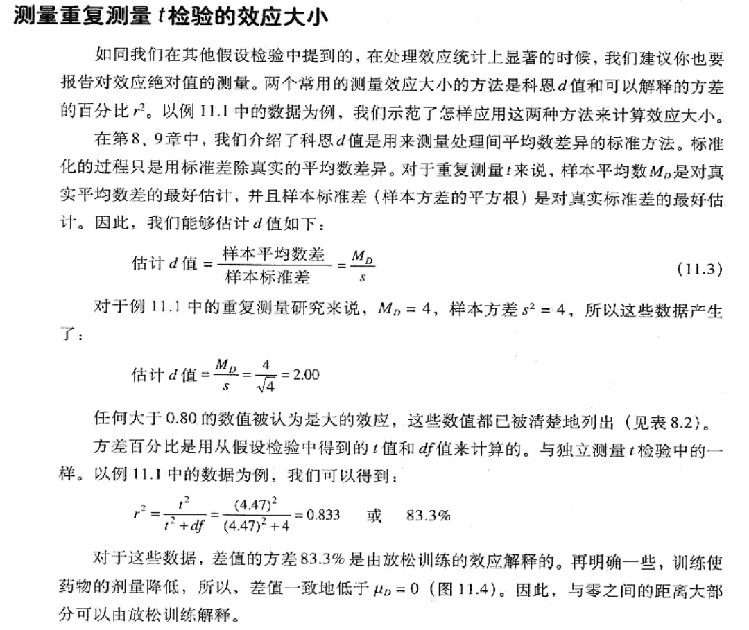 不管是对于相关样本的t检验还是之前的t检验,样本的变异性越大,那么你得到显著处理的效应的可能性就越小,也就是说你越难拒绝