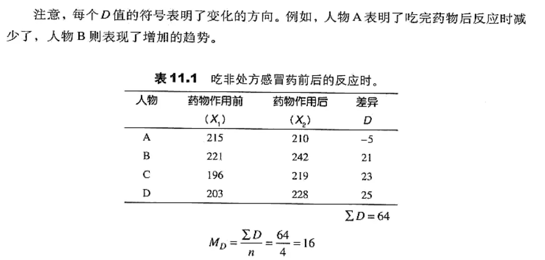 就比如上面这个相关样本的t检验,研究的是吃感冒药前后的反应时,在这种相关t检验中,我们关注的是处理前后的差异,也就是说我们关心的是D这个值,我们要计算D值的均值、方差、标准误,根据D值来计算t分数。