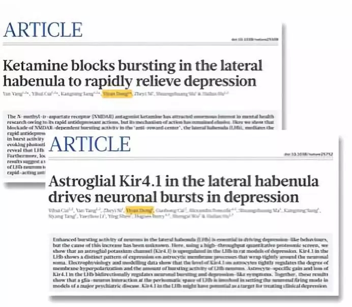 2018年2月15日,Nature同期刊发胡海岚团队两篇研究长文(Research Article),文章揭示了氯胺酮的快速抗抑郁机制,破译了抑郁症的神经密码,推进了人类关于抑郁症发病机理的认知,并为研发新型抗抑郁药物提供了多个崭新的分子靶点。