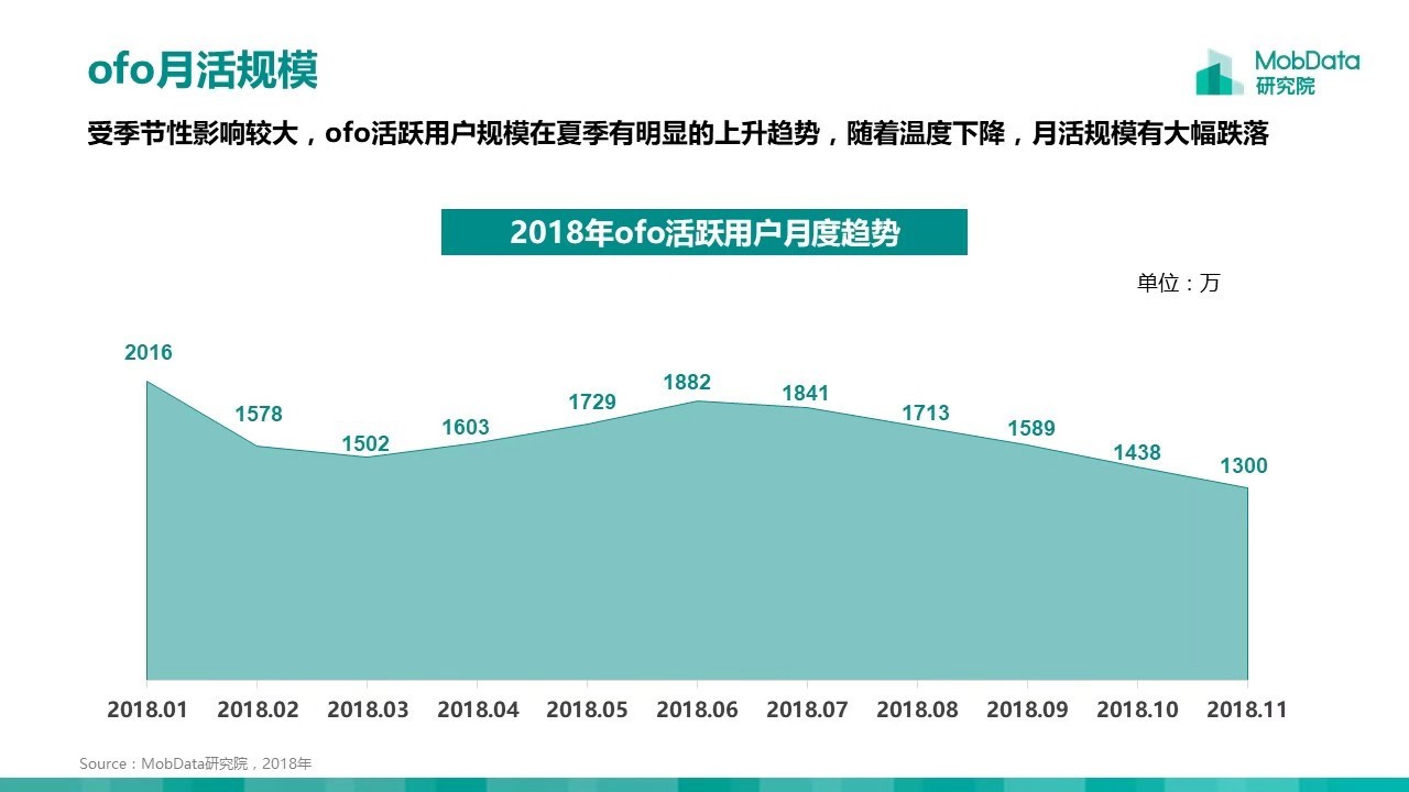 根据MobData大数据研究院对ofo市场表现的研究,我们可以看到ofo的月活跃用户从今年6月份开始就呈大福度的下降趋势,这里除了天气等外力因素之外,小黄车本身的用户流失也是占很大一部分原因。