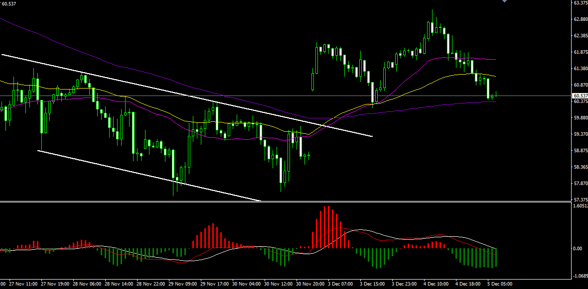 由于OPEC大会前,原油市场基本面错综复杂,近期油价走势大起大落。上一交易日,布油价格在涨至63.16后持续下跌。目前价格跌至1小时级别MA120支撑所在的60.35附近,同时该位置也是价格在本周跳空高开后的最低点。日内而言,60.35将是关键支撑,若跌破这一位置,价格可能进一步跌向59.6;若价格受此支撑反弹,则仍有机会反弹至62上方。