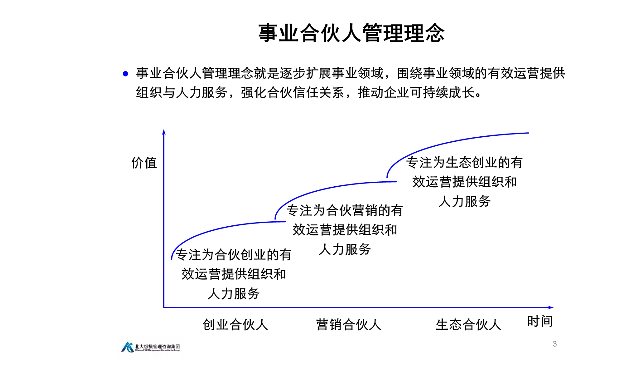 事业合伙人管理理念就是逐步扩展事业领域,围绕事业领域的有效运营提供组织和人力服务,强化合伙信任关系,推动企业可持续成长。