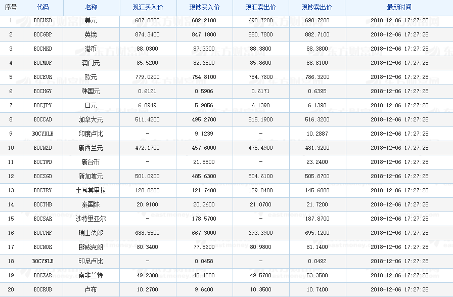 中国银行外汇牌价 2018-12-06(图片来源:东方财富网)