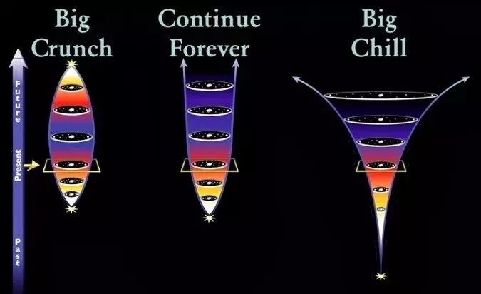 宇宙一直在膨胀膨胀膨胀,但是东西就是这么多,所以这个“气球”里面的物质就会变得越来越稀薄,如果物质的密度低过了一个“门槛儿”、一个临界值,再加上像太阳这样的恒星,该烧的也烧完了,那大家伙就开始各奔东西了,什么万有引力,谁也拴不住谁了,整个宇宙就会陷入“大冷寂”,一首《凉凉》送给你。