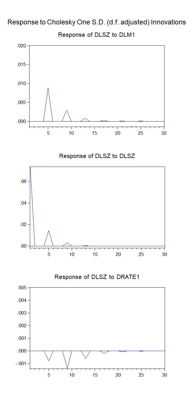 做的是货币政策对股票市场影响,4阶VAR模型。从上到下分别是上证指数对M1,上证指数,定期一年期存款基准利率的冲激响应。