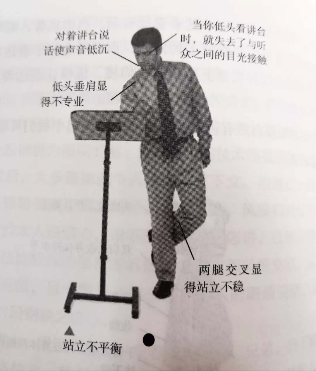 同时,表达者还需要避免一些不良的站姿,其中包括: