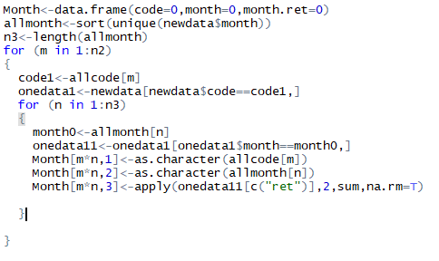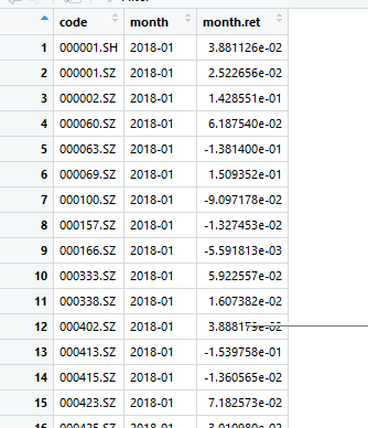 这张图是题目,newdata数据框,一共300个股票11个月的收益情况,最后一列ret是日收益率,现在要建立一个数据框,显示code,月份,月度收益率(就是每个月所有日收益率求和)