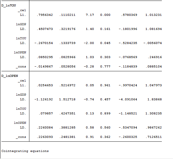 这是我用stata跑出的结果,想知道依据哪几个值确定误差修正项ecm(-1)的系数,请教懂的人,谢谢! 2.png 3.png