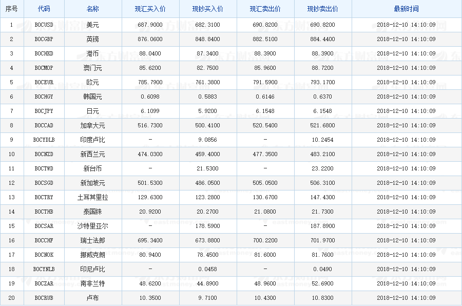 中国银行外汇牌价 2018-12-10(图片来源:东方财富网)