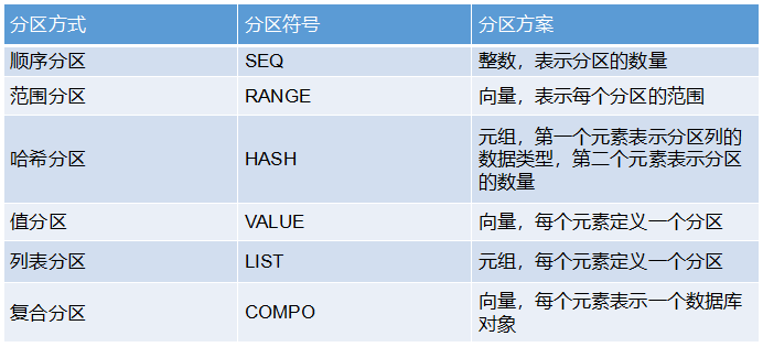partitionType:分区方式,有6种方式: 顺序分区(SEQ),范围分区(RANGE),哈希分区(HASH),值分区(VALUE),列表分区(LIST),复合分区(COMPO)。